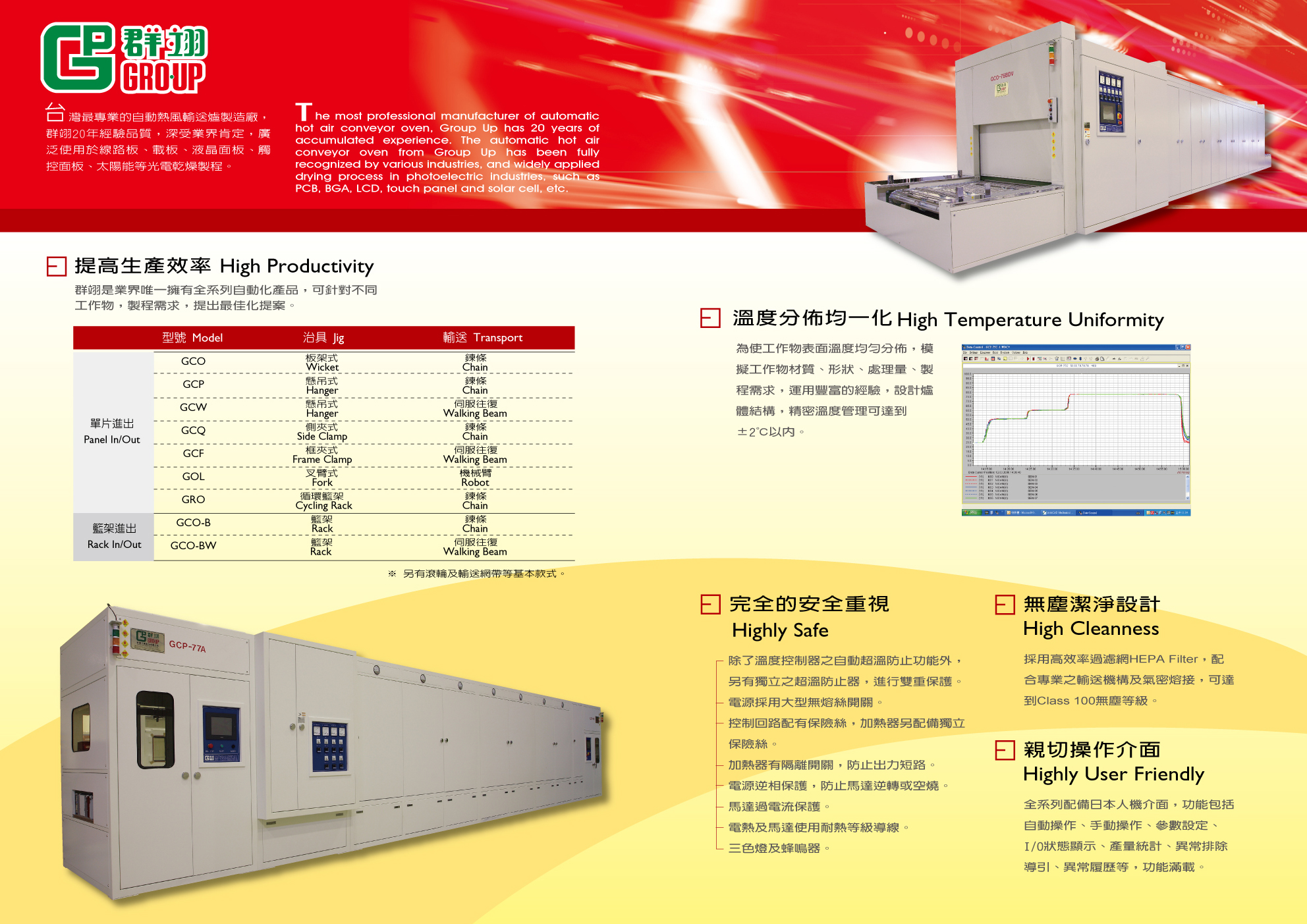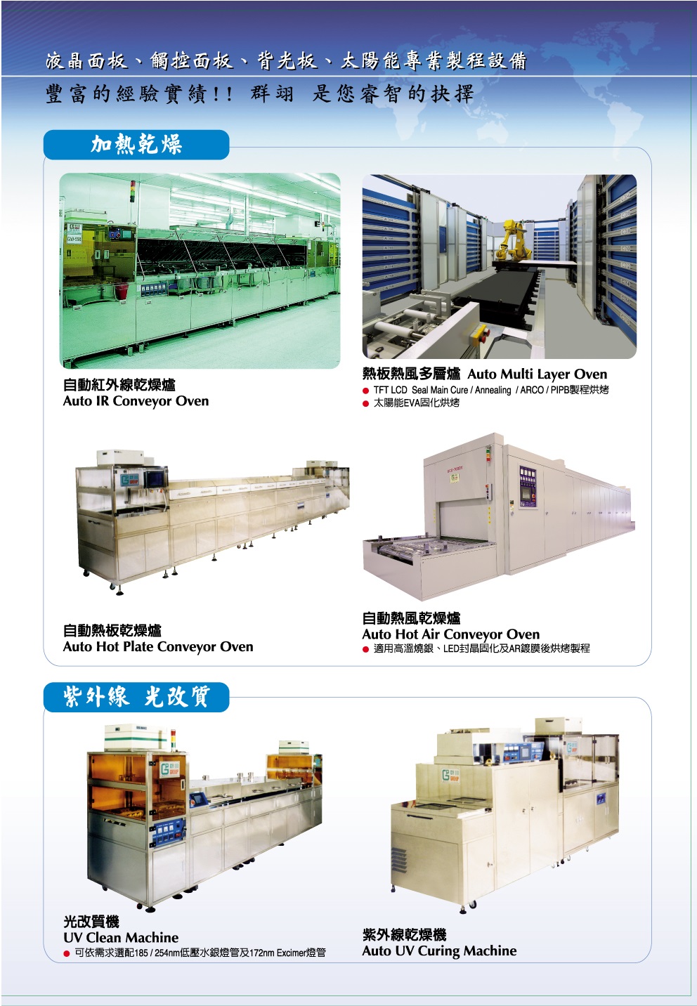 台灣最專業的自動熱風輸送爐製造廠,群翊30年經驗品質,深受業界肯定,廣泛使用於線路板、載板、液晶面板、觸控面板、太陽能等光電乾燥製程。