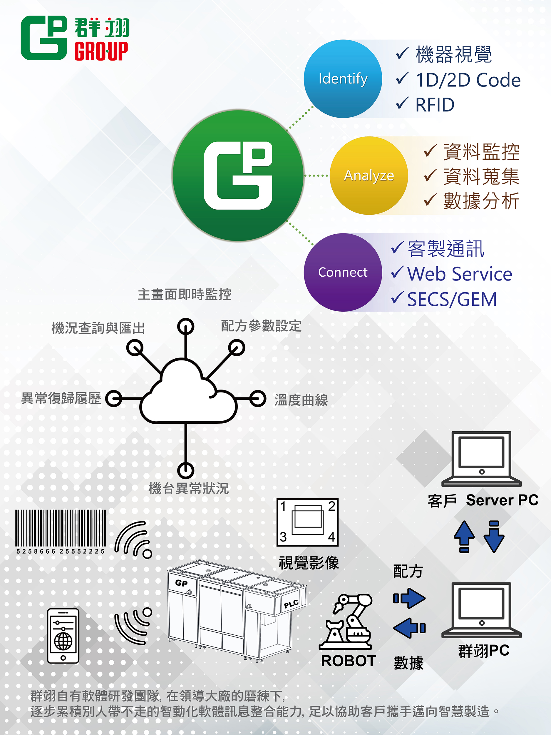 群翊自有研發團隊,在國際領導大廠的磨練下,逐步累積別人帶不走的智動化軟體訊息整合能力,足以協助客戶攜手邁向智慧製造。