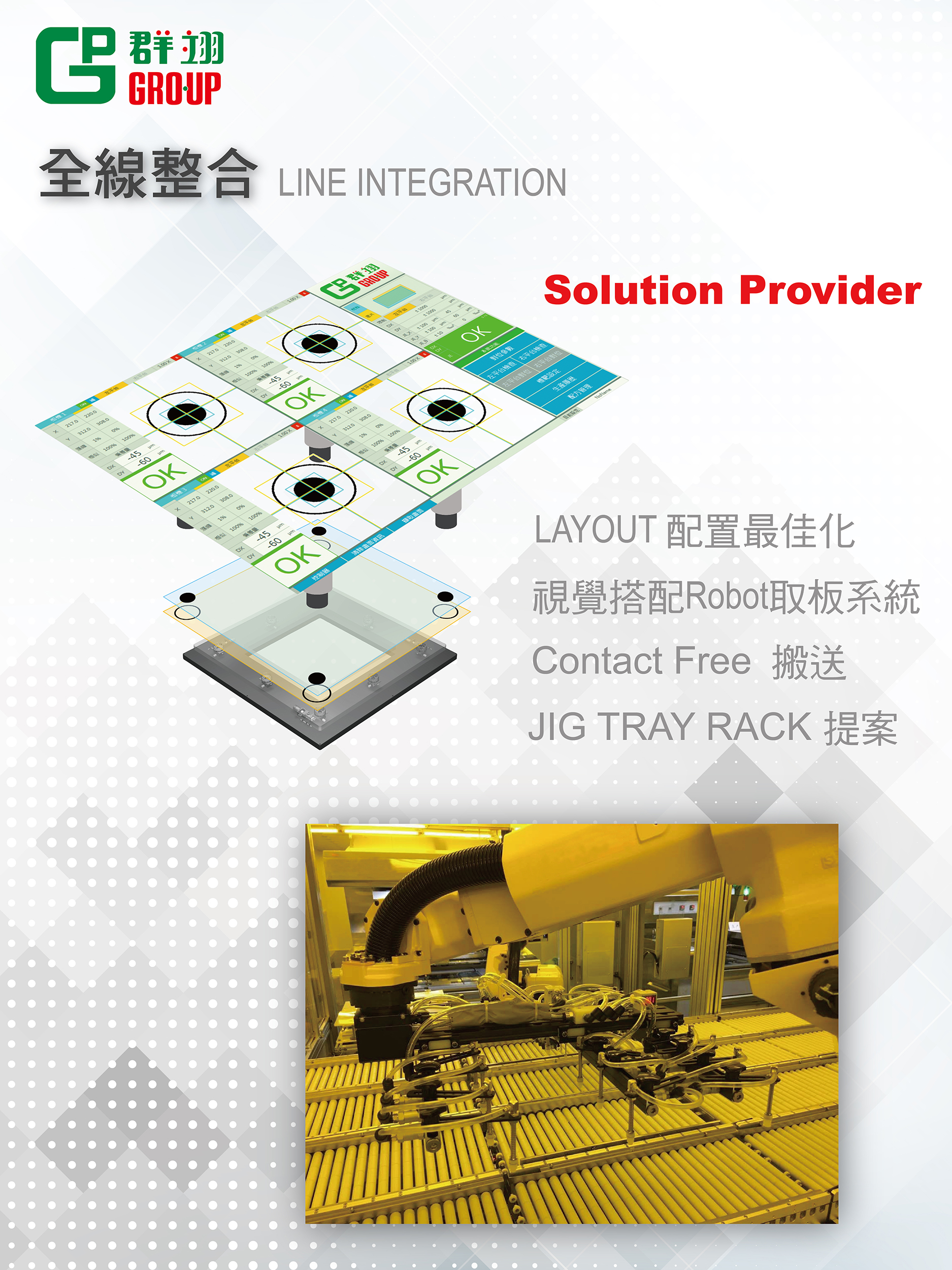 群翊有豐沛的自動化經驗, 從治具,承盤,籃具,搬送方式,連線單機, 搭配視覺之自動搬運車及自動機械手臂,可提供最佳化的配置規劃, 提升產能及生產良率。